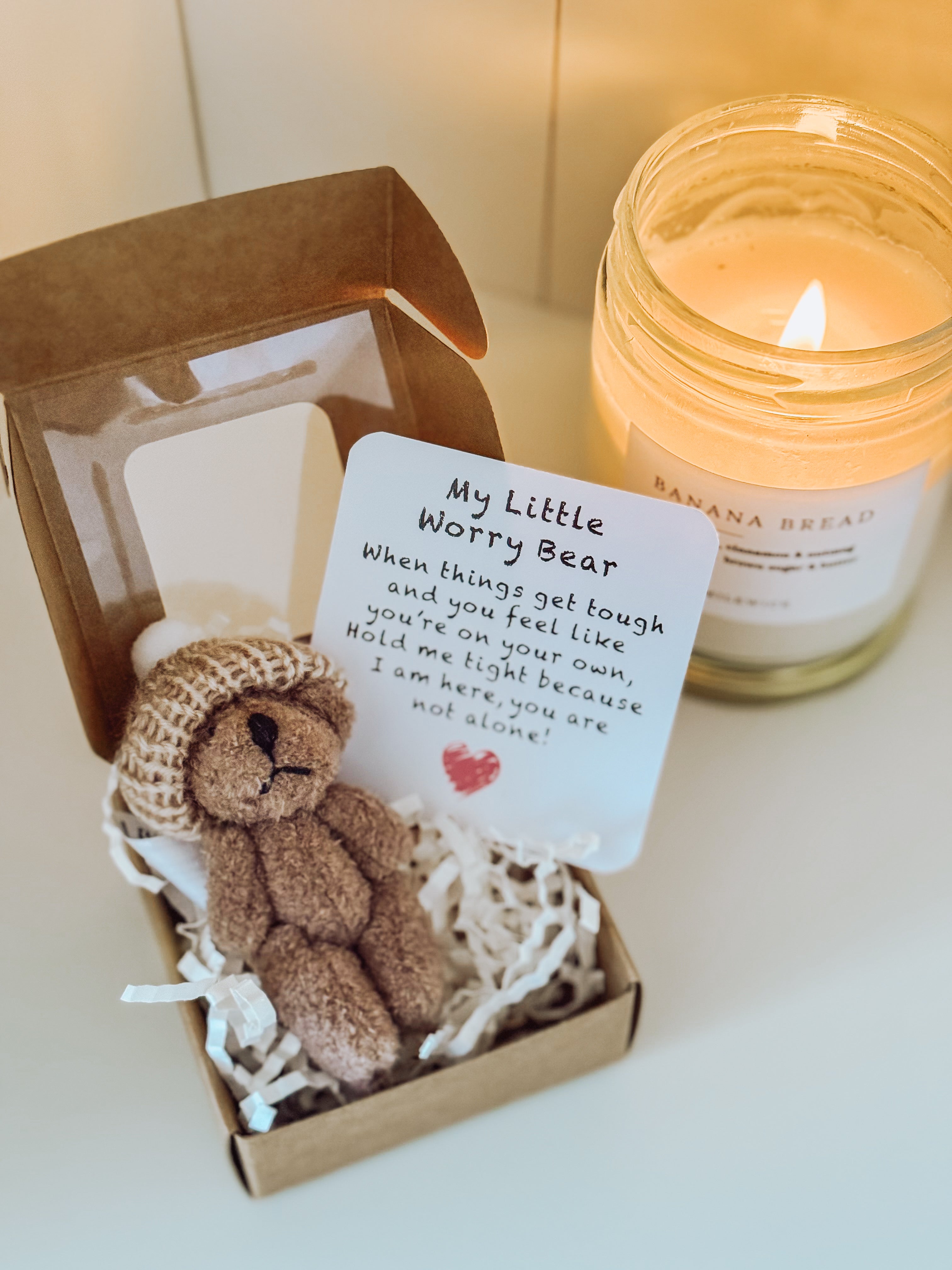 What an absolutely gorgeous idea! A Worry Bear!! My daughter has been feeling a bit down lately and I am 2 hours drive away from her. I purchased one to send to her just to give her a bit of a lift. Such beautiful packaging. I wish I could see her face when she opens it! I've purchased another three of these just to keep for in case a friend is having a rough time. Thank you Milkwick! These are just delightful!