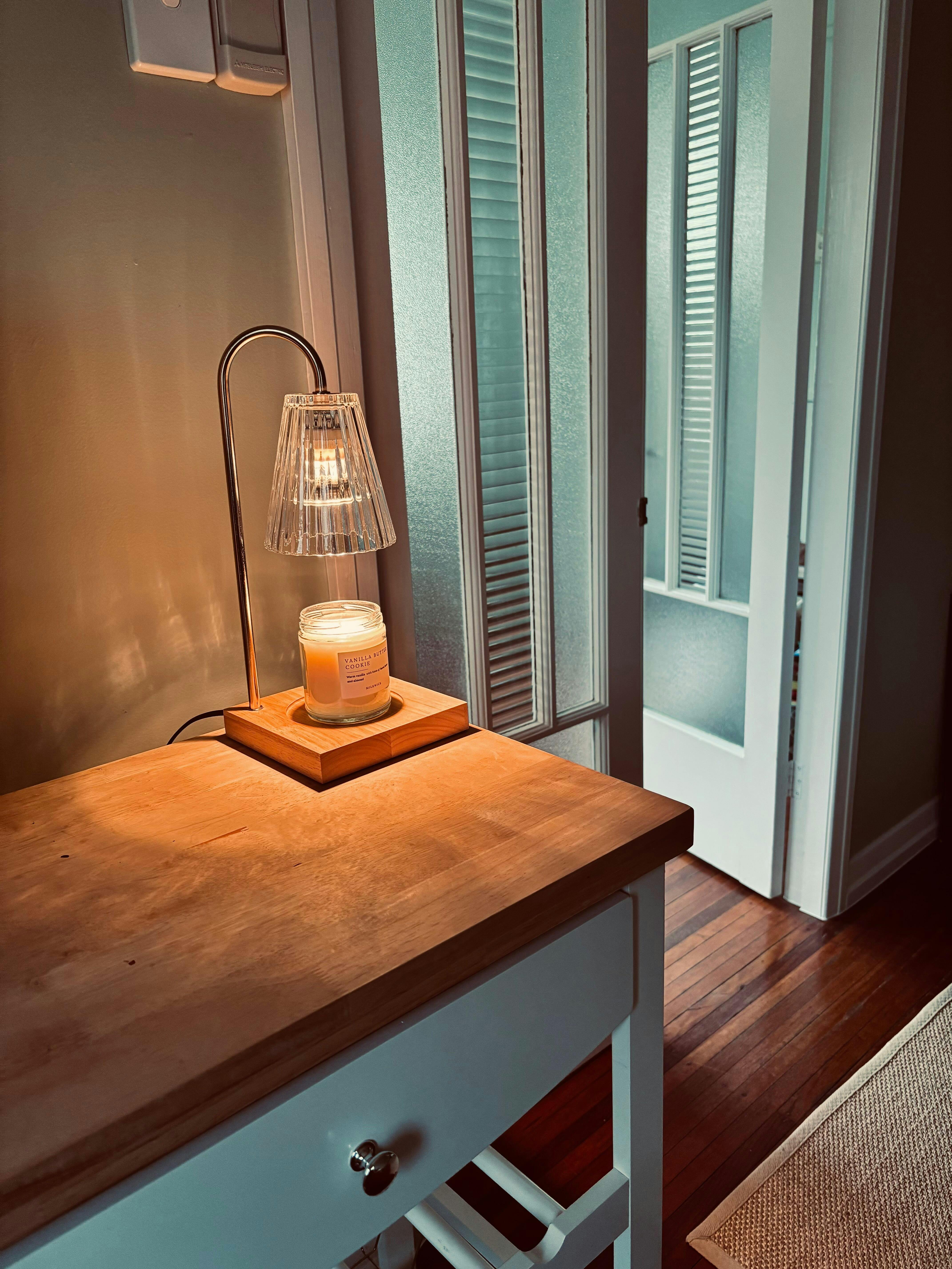 Our beautiful pleated glass & gold stem Candle Warmer Lamp, is a safe way to enjoy the beautiful fragrance from your candle without the flame.