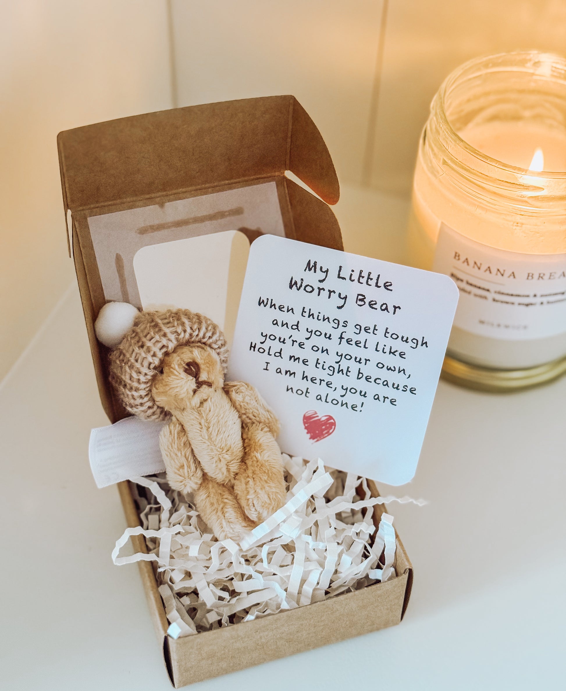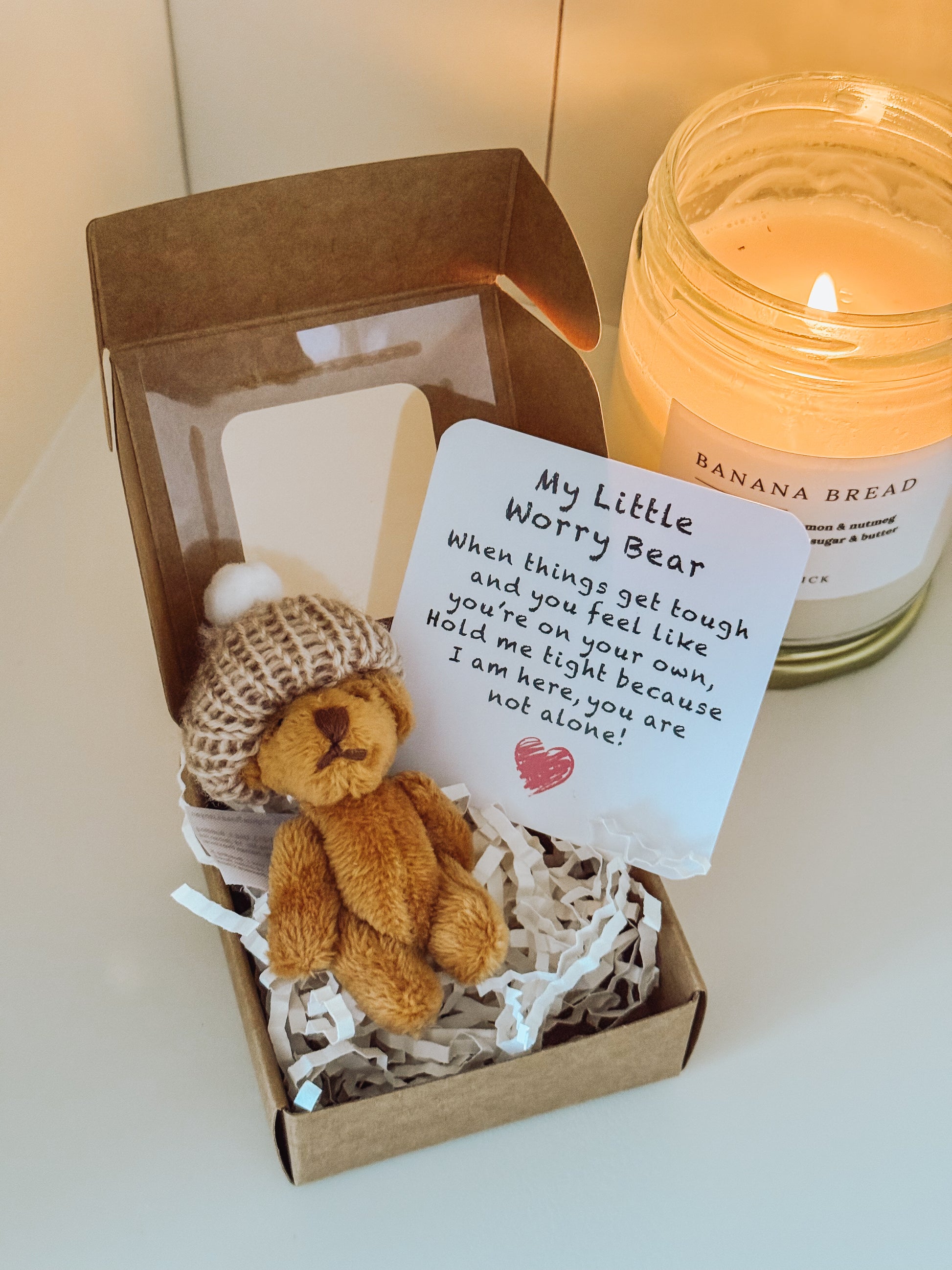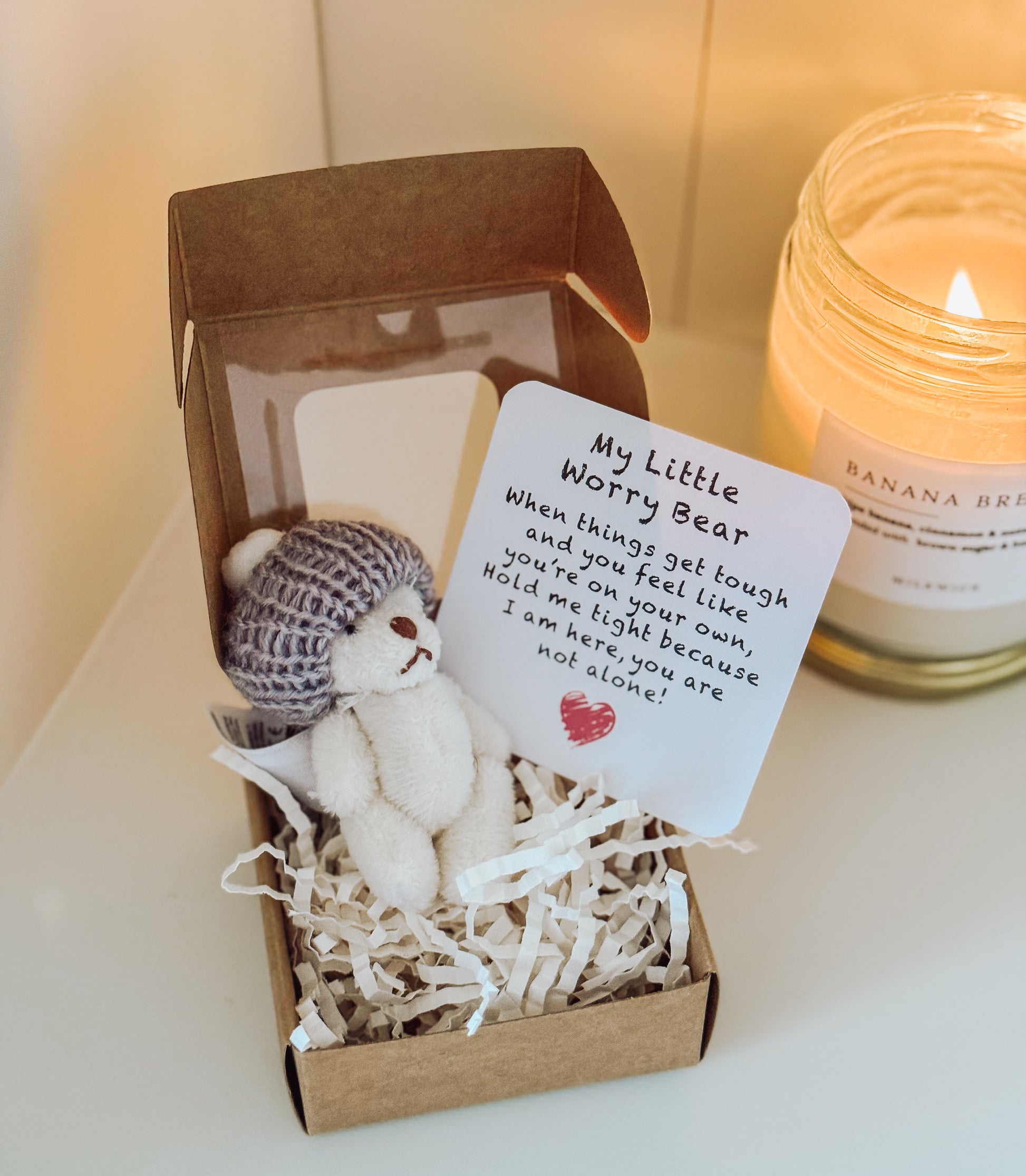 This miniature soft "worry" bear with a cute little beanie, is the perfect gift for an anxious person or someone who may be going through a stressful time in their lives.