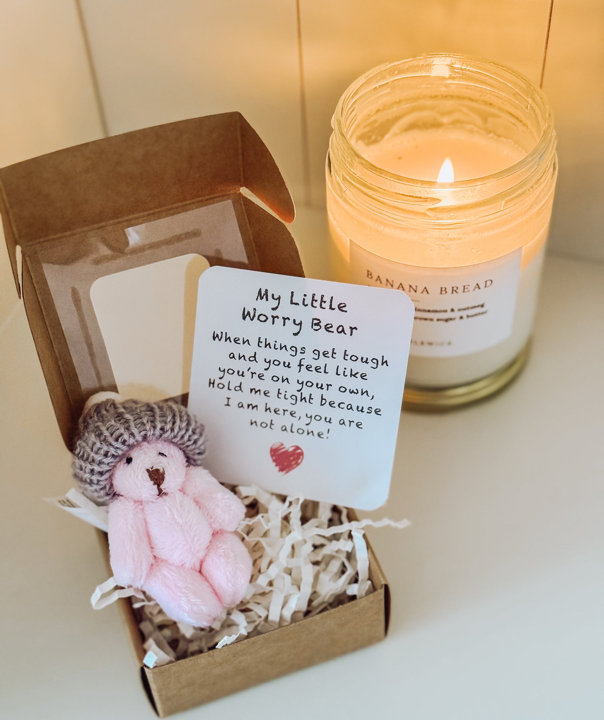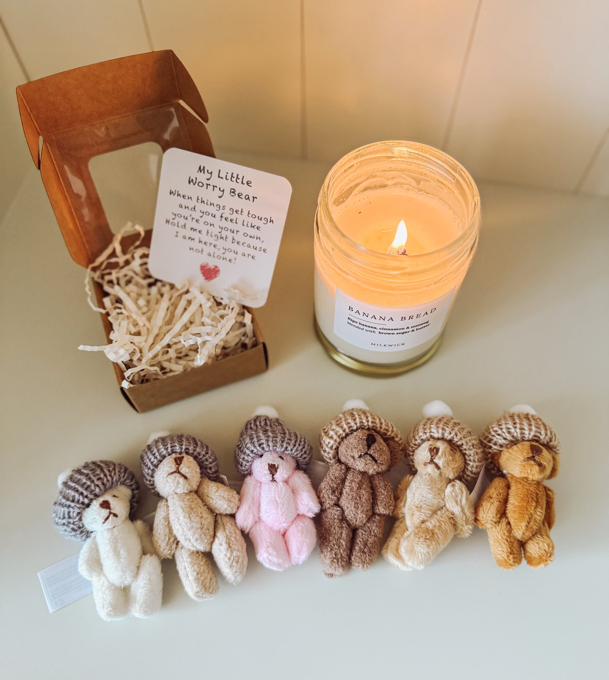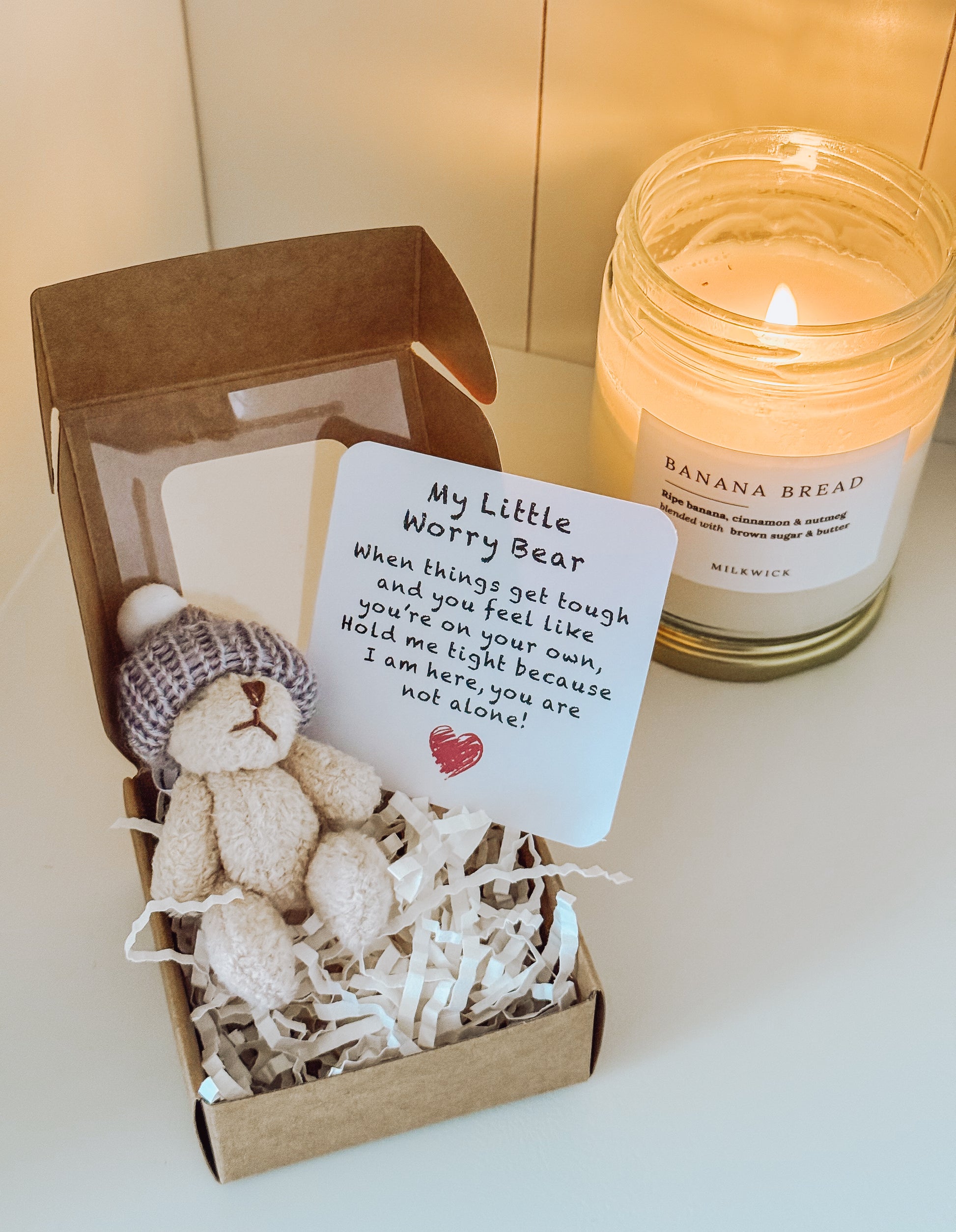 This miniature soft "worry" bear with a cute little beanie, is the perfect gift for an anxious person or someone who may be going through a stressful time in their lives.